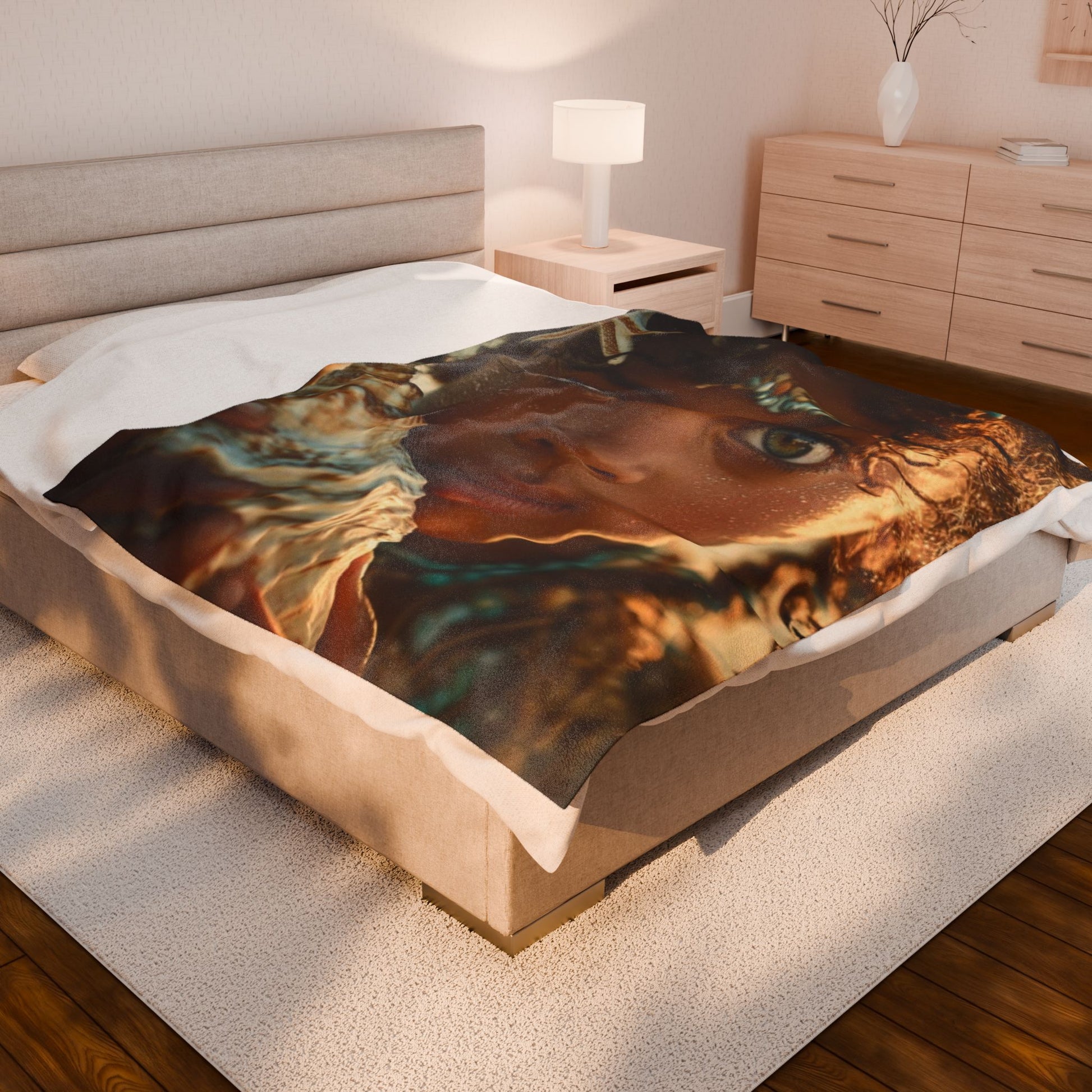 A velvety plush blanket printed with a warm, soulful portrait that brings quiet seaside memories into your home. The image—rich in amber tones and detailed color—wraps across one side, creating a tactile focal point that invites lingering. Lightweight yet cozy, the blanket drapes easily over a sofa or chair and becomes a go-to layer for cool evenings. It feels soft against the skin and keeps its vivid print through regular use. Bring this blanket out during slow moments: reading by lamplight, watching the sun set, or settling in with a cup of tea. Its expressive artwork and soft hand make it an intimate, comforting presence in everyday life.